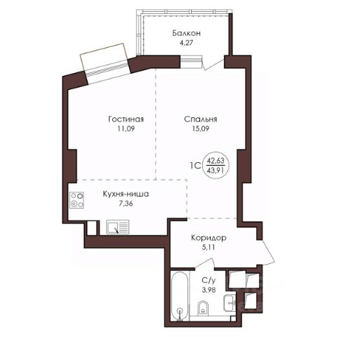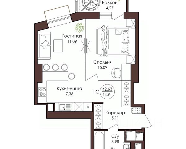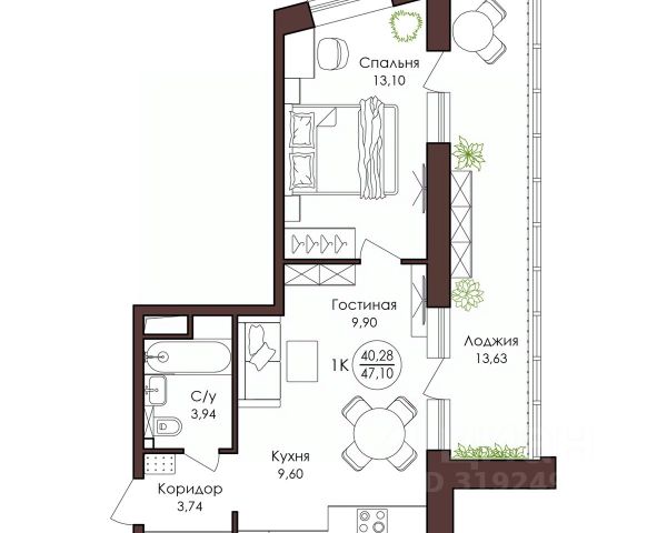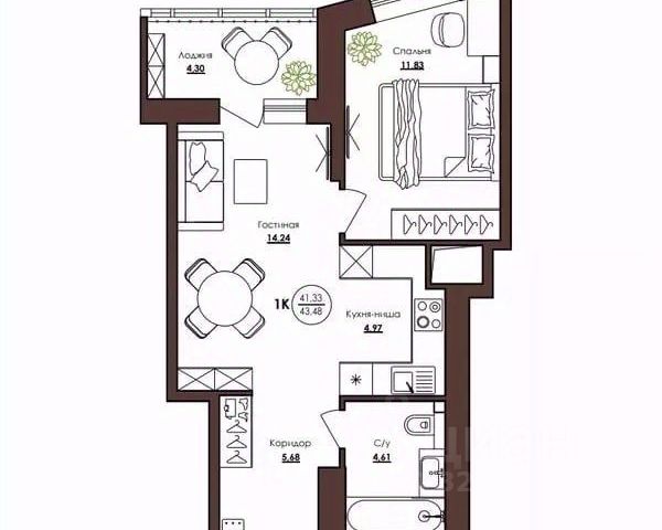 Двухкомнатная квартира для семьи с ребёнком; Эргономичная кухня вместит необходимую мебель и технику для реализации ваших кулинарных идей; Гардеробные ниши позволят не тратиться на шкафы и комоды и сохранить полезную площадь; Уютная лоджия станет отличным местом для релакса или хранения; Окна на 2 стороны света
