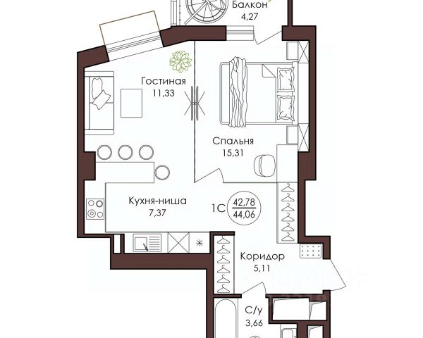 Компактная студия для молодой пары и людей, ценящих спокойную и уединённую жизнь; Основная комната позволяет с комфортом расставить мебель для готовки, отдыха и приёма гостей; На лоджии легко организовать зону релакса или место для хранения; Большая гардеробная ниша исключает необходимость покупки шкафа.