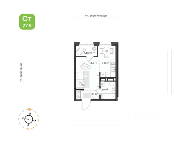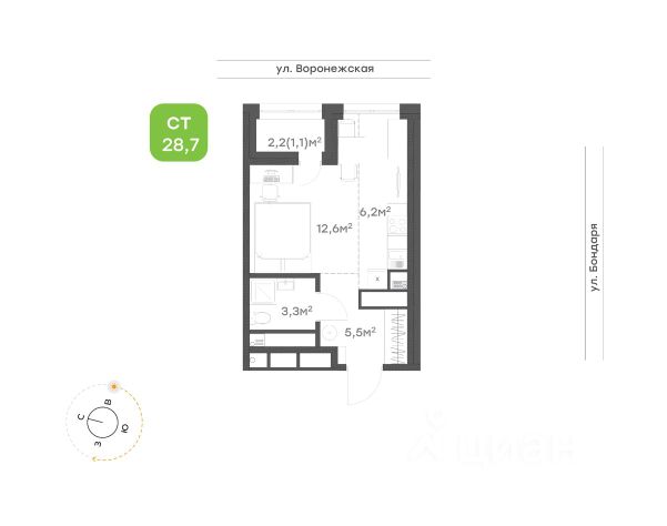 Компактная и функциональная студия для молодой семьи и людей, ценящих спокойную и уединённую жизнь. Кухня-ниша легко вместит всю необходимую технику для реализации ваших кулинарных фантазий. Гостиная позволит зонировать место для отдыха, учёбы и работы. Лоджия станет отличным местом для релакса.