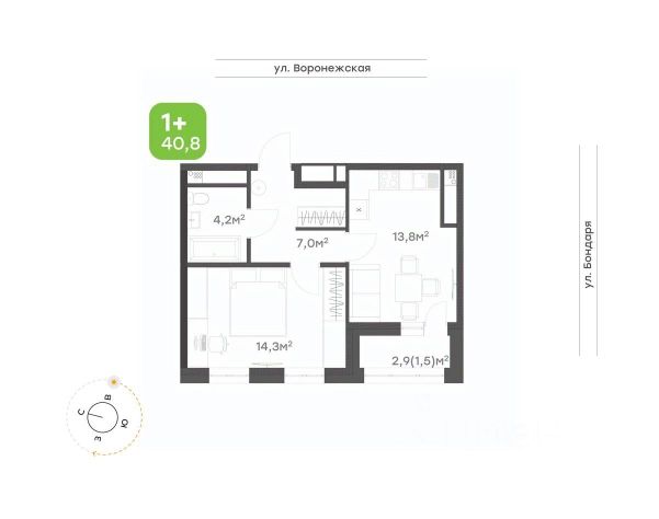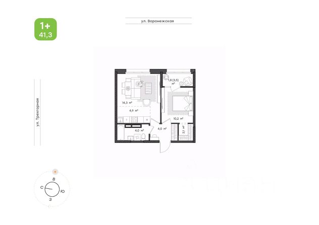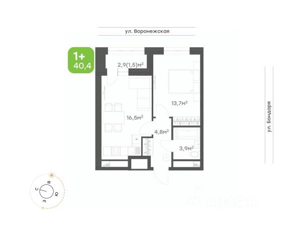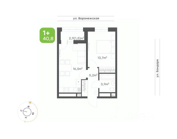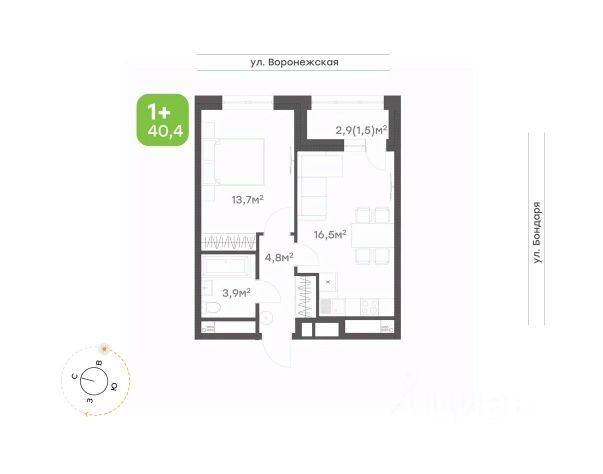 Современная однокомнатная квартира с функциональной планировкой • Холл 6 кв.м. с удобной нишей добавит дополнительное пространство для хранения; • Увеличенная кухня-гостиная 16,9 кв.м с двумя окнами для отдыха и общения; • Спальная комната с выходом на лоджию. Вид из квартиры открывается на ул. Воронежская; • Совмещенный санузел 4,4 кв.м для удобства всех жильцов; • Это отличный выбор для тех, кто ценит комфорт.