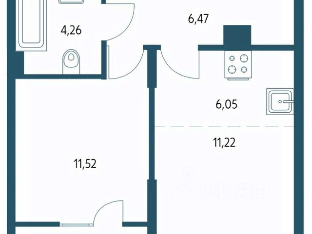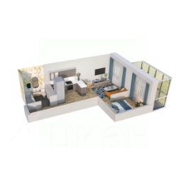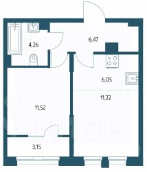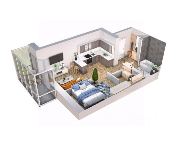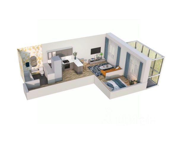 Светлая и комфортная евродвушка 42 м². Здесь спальня, просторная кухня-гостиная, санузел и балкон с панорамным видом, который можно оборудовать как зону отдыха или рабочее место.