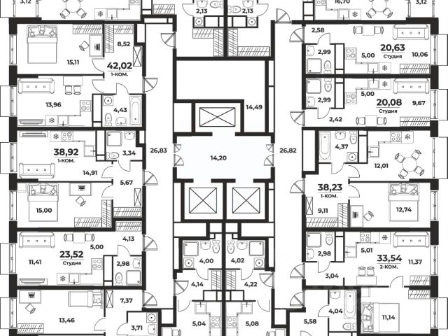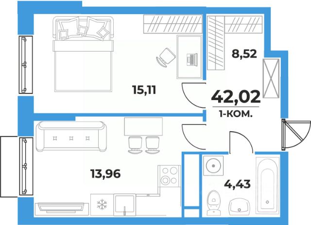 • Функциональность и ничего лишнего • Оптимально для молодой семьи, холостяков и семьи, у которой дети выросли и живут отдельно • Просторная кухня-гостиная с выходом на лоджию, в котором можно обустроить кабинет или зону отдыха • Спальня правильной формы с нишей под гардероб • Прихожая с нишей под шкаф-купе • Совмещенный санузел 4,2 кв. м.