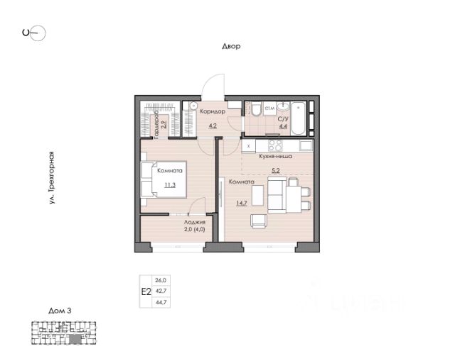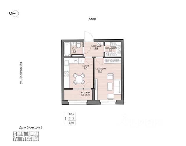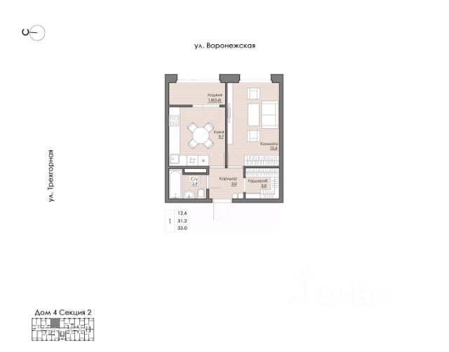 Хорошая планировка: зал 17.2 кв.м, кухня 9.3 кв.м, коридор 5.4 кв.м, санузел 2.9 кв.м, ниша 0,5 кв.м, лоджия 6.0 кв.м.