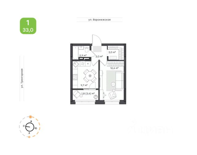 Однокомнатная квартира евроформата Интересная особенность - кухня-гостиная с нишей под гарнитур и возможностью установить барную стойку. Гостиная с выходом на лоджию, с которой открывается вид на ул. Воронежская. Уютная спальня с местом под стеллаж или шкаф.