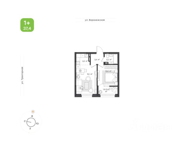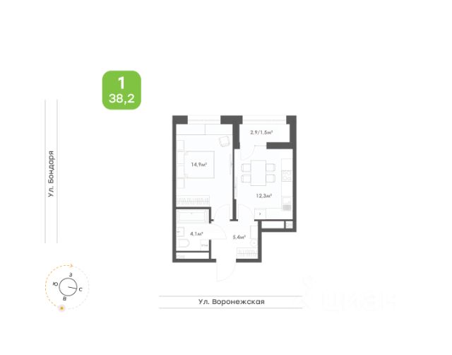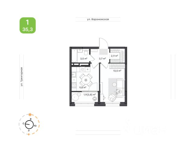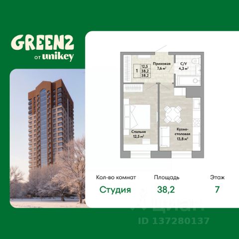 Однокомнатная квартира от застройщика в ЖК "Green 2" на 7 этаже. Квартира без отделки, полностью готова к ремонту. Общая площадь: 38.2 кв.м., жилая: 12.5 кв.м., площадь просторной кухни-столовой: 13.8 кв.м. Все окна выходят на одну сторону. В квартире один совмещенный санузел. Высота потолков 2.7 м.