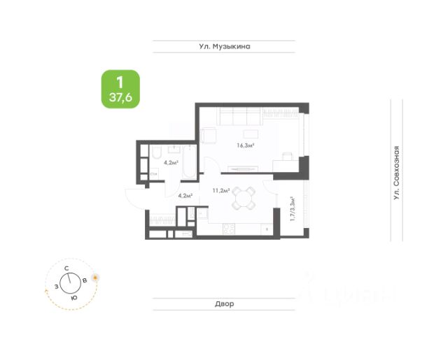 Однокомнатная квартира для семейной пары или молодых людей • Прихожая 4,8 кв.м с нишей под гардероб; • Уютная классическая кухня 9,6 кв.м; • Гостиная, где можно организовать полноценное рабочее место; • Окна квартиры и лоджия выходят на благоустроенный двор; • Совмещенный санузел 4,2 кв.м.