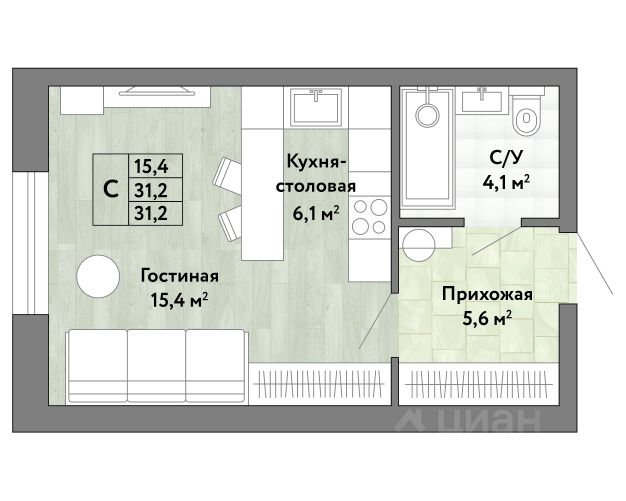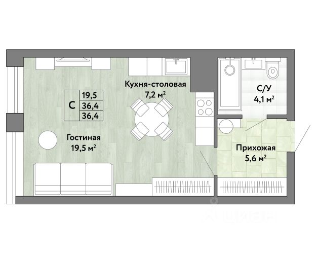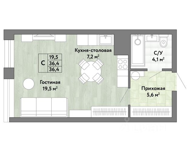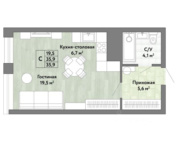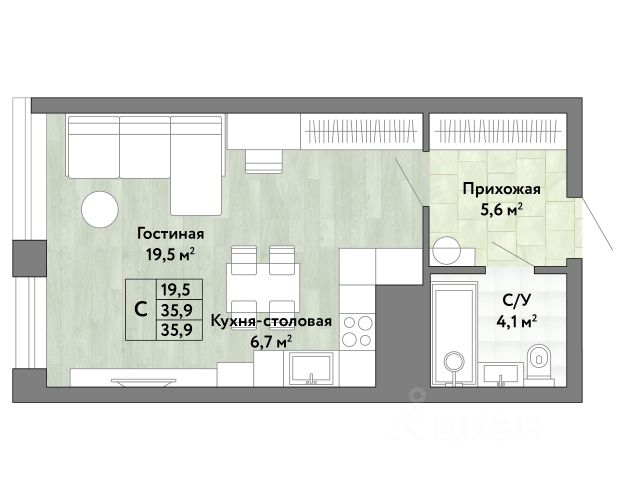 Просторная светлая 1-комнатная квартира 33-36 м². Здесь спальня, кухня-гостиная, комфортный санузел, гардеробная и постирочная, а также лоджия, которую можно оборудовать как зону отдыха или кабинет.