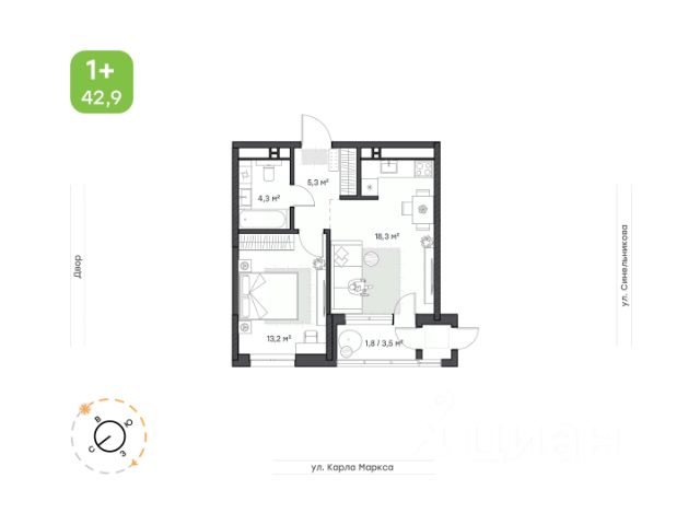 Классическая планировка однокомнатной квартиры; Просторная кухня-столовая позволит воплотить свои кулинарные фантазии и с комфортом встретить гостей; В гардеробной нише с гостиной легко сложить вещи и не тратиться на покупку шкафов и комодов;