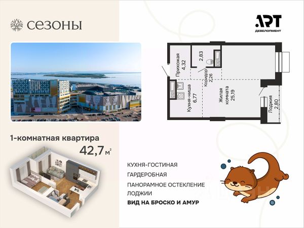 Осенние скидки! Выгода до 1,9 миллиона рублей. Квартира 43,4 кв.м свободной планировки с видами на город, Амур и Броско. - кладовая - большой санузел - панорамное остекление балкона - кухня-гостиная - вид на Амур ДВ ипотeка 2%, семейная ипотека 6%. Льготная ипотека без удорожания, трейд-ин Семейная комбо-ипотека до 15 млн 0% индивидуальное предложение от застройщика Отделка вайтбокс 13 000 руб за кв.м. - 3 минуты до центра на авто - 11 маршрутов общественного транспорта - 2 минуты пешком до Броско и аквапарка - 5 минут пешком до школы - 3 минуты пешком до детского сада - 30 шагов до паркинга в доме - 1 взгляд до вдохновляющих видов ЗАКРЫТАЯ ТЕРРИТОРИЯ Территория двора огорожена забором, и будет много камер. Доступ на территорию будет регулироваться воротами с индивидуальным доступом, отдельно будет настроен доступ в дом, паркинг, велосипедные и колясочные пространства. ИНТЕРЕСНЫЙ ДВОР, АТМОСФЕРНЫЕ ПРОСТРАНСТВА ДОМА Стильное пространство холла с высоким потолком, французскими окнами и качественной отделкой. По территории двора ограничен проезд, бОльшая часть парковок находится под землей. Предусмотрены также и гостевые парковки они расположены снаружи комплекса вдоль коммерческих помещений. Авторская детская площадка: длинная горка, тактильная дорожка, батуты, скалодром и канаты. Двор будет уникальным. Есть воркаут-зона для занятий спортом, и есть место где можно почитать книгу и тропа в травах, для создания которой растения с цветением по разным сезонам высадят согласно дендроплану. АРХИТЕКТУРА, ПЛАНИРОВКИ Комплекс состоит из трех зданий переменной этажности, второе и третье здание соединены двухэтажным стилобатом, в котором разместятся компании для ежедневного комфорта жителей дома: магазины, кофейня, салон красоты, детское обучение и досуг. Мы видим ценность в долговечных фасадных решениях, поэтому выбрали сочетание керамогранита и клинкерного кирпича. Предусмотрели ненавязчивую пластику фасада, архитектурную подсветку в специальных нишах. В первом доме заложены квартиры свободной планировки для воплощения вашего сценария жизни в диапазоне от 35,33 до 122,99 кв.м. ИЗ ТЕПЛОЙ КВАРТИРЫ В ТЕПЛЫЙ ПАРКИНГ В подземный паркинг спускаются все три быстрых лифта. Пробок не предвидится даже в час пик. КАЧЕСТВЕННОЕ ОКРУЖЕНИЕ От Сезонов до школы ноль перекрестков, рядом можно поесть разнообразно и вкусно, сводить ребенка в игровое пространство, купить продукты в минимаркете или в гипермаркете Броско. Кинотеатр через дорогу, новый корпус Броско Волна. У вас много возможностей. Все продажи ведутся через безопасные эскроу-счета.
