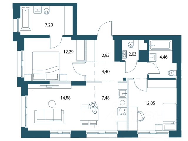2е жилые комнаты и гостинная-кухня, 2е лоджии,