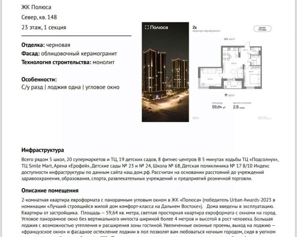 2-комнатная квартира евроформата с панорамным угловым окном в ЖК "Полюса" (победитель Urban Awards-2023 в номинации "Лучший строящийся жилой дом комфорт-класса на Дальнем Востоке"). Дома введены в эксплуатацию. Квартиры от застройщика. Площадь — 59,64 кв. метра, светлая просторная квартира евроформата с окнами на город. Угловое панорамное окно без вертикального импоста шириной более 4 метров и высотой в рост человека. Большая лоджия с возможностью утепления и расширения зоны гостиной. Увеличенные оконные проемы, выход на лоджию — "французское окно" и фасадное остекление лоджии в пол позволят вам любоваться ночным городом, сидя в уютном кресле с чашечкой чая у себя дома. ЖК "Полюса" — современные дома, открывающие настоящий комфорт для жильцов: • Два дома на берегу Амура в микрорайоне "Строитель" • Панорамные угловые окна с впечатляющими видами на Амур, закаты и город • Большой закрытый двор • Авторский проект благоустройства с ландшафтным дизайном от московской компании АFА Gроuр • Своя спортивная и детская площадки с игровым оборудованием мировых производителей • Зелёный двор: более 300 крупноразмерных деревьев и кустарников, цветники и газоны • Архитектурная подсветка домов и двора с несколькими сценариями освещения • Свой подземный и наземный паркинг • Сквозной подъезд со своим выходом на набережную • Весь двор и входы в подъезды с большими прозрачными входными группами на одном уровне • Дизайнерские холлы больше 100 кв. м с лапомойкой и санузлом на первом этаже • Система "Умный дом" с приложением жильца: показания счетчиков, заявки в Службу комфорта (управляющая компания ЖК) через приложение с отслеживанием статуса заявки, оплата счетов, удаленный доступ к видеонаблюдению, дистанционному управлению домофоном и системами доступа во двор и на паркинг • Защищенная и безопасная среда во дворе и доме • Дизайнерские металлические двери в квартиру с "умным" замком: биометрия, NFC-метка и прочие возможности бесключевого доступа • Квартиры со свободной планировкой позволят спланировать пространство под себя и свои сценарии жизни Квартиры подходят под все виды ипотек (субсидированная). Вы можете записаться на презентацию через отдел продаж. Откройте горизонты комфортной жизни!