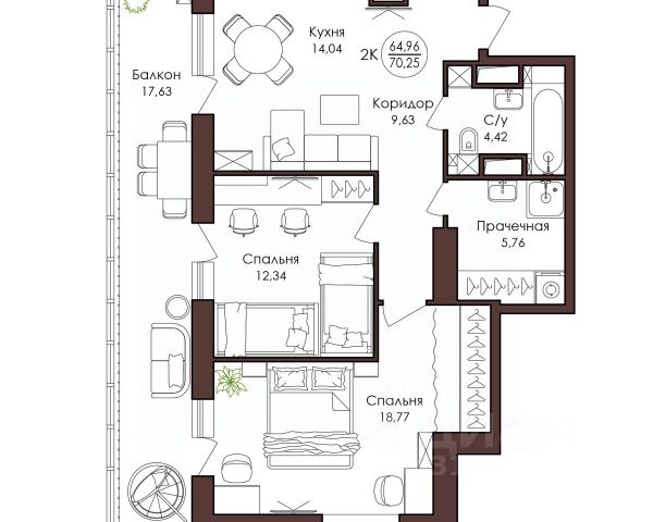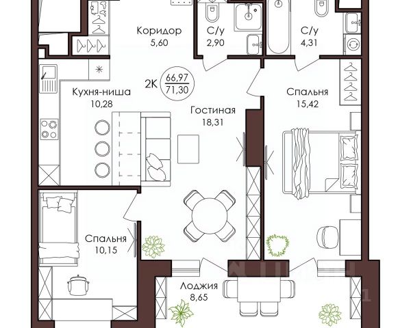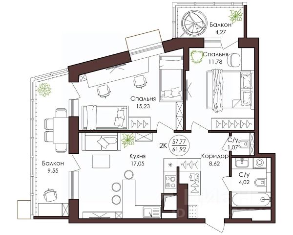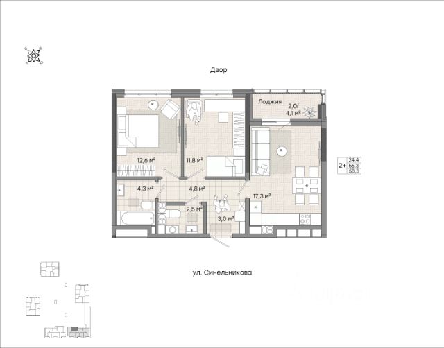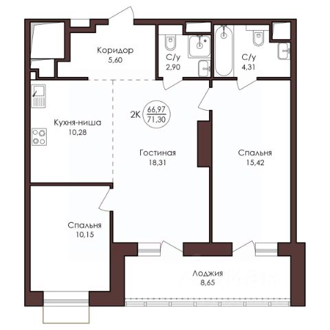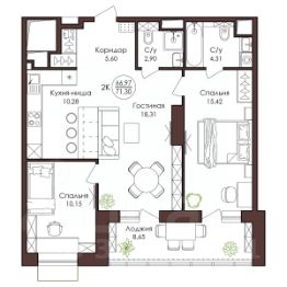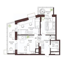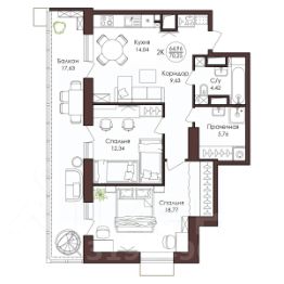 Двухкомнатная квартира для семьи с ребёнком; Эргономичная кухня вместит необходимую мебель и технику для реализации ваших кулинарных идей; Гардеробные ниши позволят не тратиться на шкафы и комоды и сохранить полезную площадь; Уютная лоджия станет отличным местом для релакса или хранения; Окна на 2 стороны света