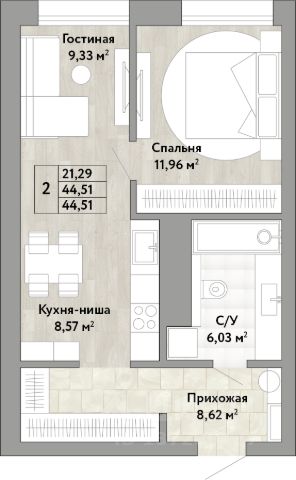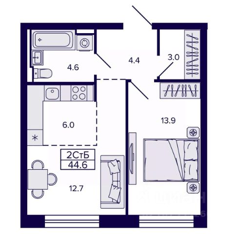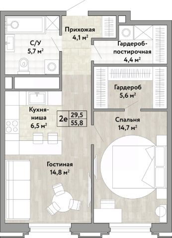 Светлая 3-комнaтная кваpтира 55 м² на южной стороне Здесь 3 отдельные комнаты, кухня-гостиная, большой санузел, гардеробная и балкон, который можно оборудовать как зону отдыха или кабинет.