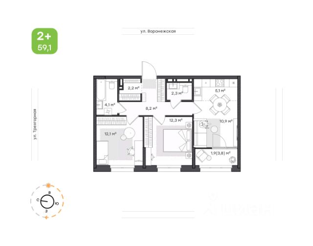 Продаётся 2-комнатная квартира 57,59 м2 от застройщика в жилом комплексе "Аккорд".