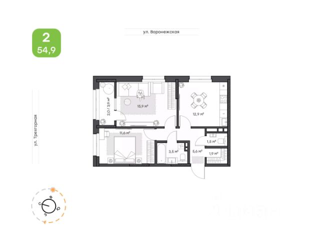 Функциональная 2-комнатная (евротрешка) 47 м². Здесь 2 отдельных спальни, кухня-гостиная, комфортный санузел и большой балкон с панорамным видом, который можно оборудовать как зону отдыха или рабочее место.