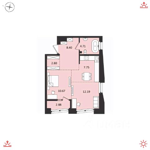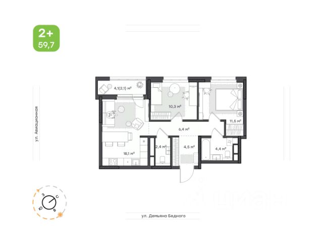 Светлая евротрешка 62 м². Здесь 2 отдельных спальни, просторная кухня-гостиная, комфортный санузел и большой балкон с панорамным видом, который можно оборудовать как зону отдыха или рабочее место.
