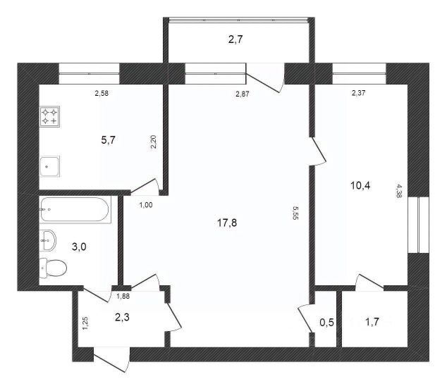 Общая площадь квартиры составляет 44,3 м², жилая площадь 29,4 м²,