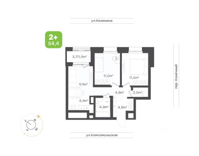 Оцените преимущество углового расположения 2+ квартиры — вид на две стороны света Кухня-гостиная с возможностью зонирования мест для готовки и отдыха и выходом на балкон Просторные спальни в которых легко расставить мебель для отдыха и работы Два санузла Большое количество гардеробных ниш сможет вместить основной объём вещей