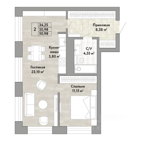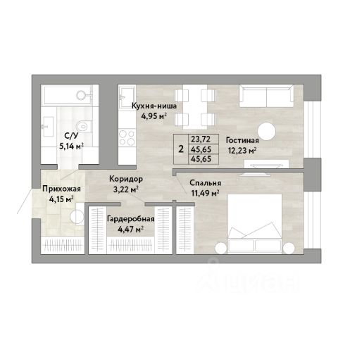 Светлая 3-комнaтная кваpтира 55 м² на южной стороне Здесь 3 отдельные комнаты, кухня-гостиная, большой санузел, гардеробная и балкон, который можно оборудовать как зону отдыха или кабинет.