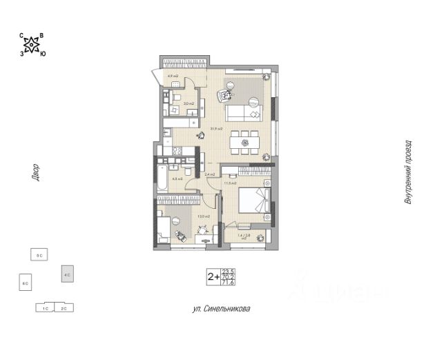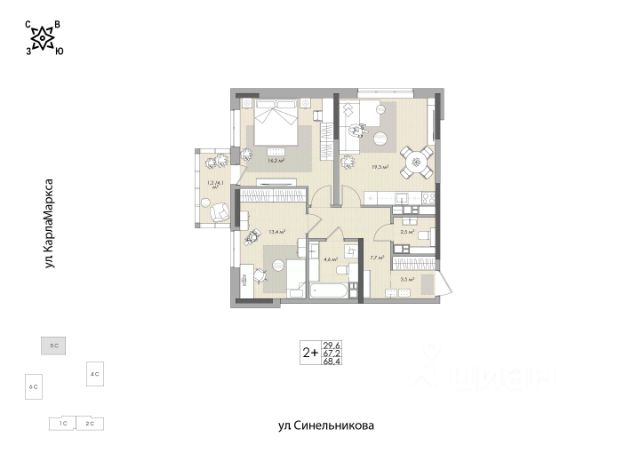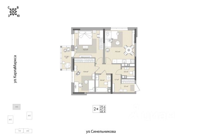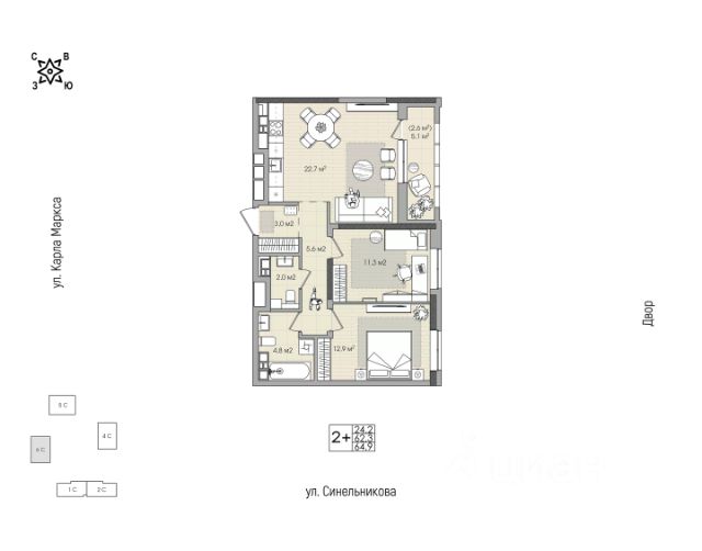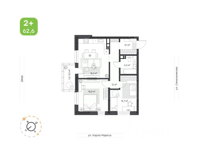 2,5-комнатная квартира в для семьи с ребёнком; Кухня-гостиная с зонированием мест для готовки и отдыха; Просторные спальни позволят с организовать комфортные места для отдыха и работы; Просторный балкон даст возможность поставить мебель для отдыха или организовать хранение вещей; Высота потолков 2,7 метра; Два санузла