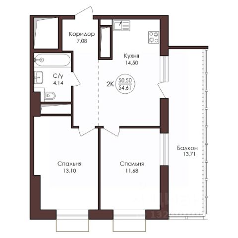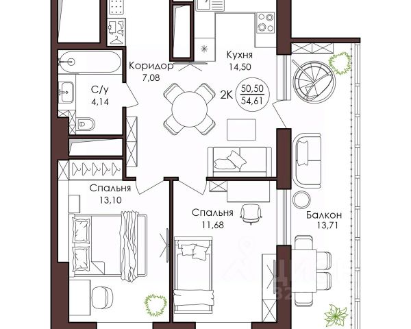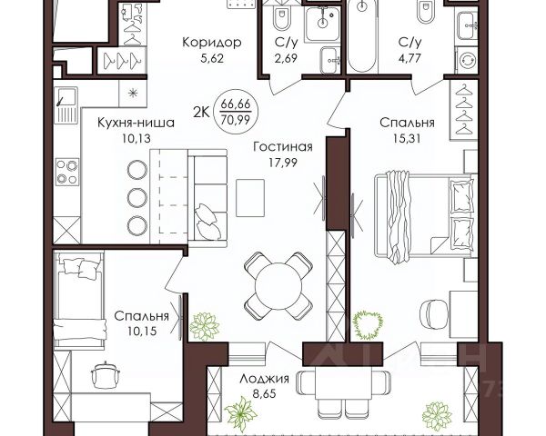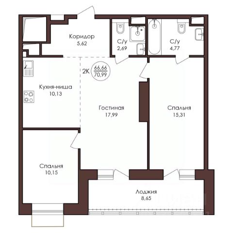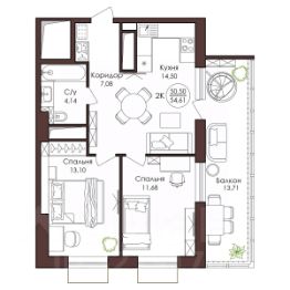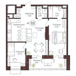 2+ квартира для семьи с ребёнком; Просторная кухня-гостиная с выходом на лоджию; Гардеробные ниши позволят не тратиться на шкафы и комоды и сохранить полезную площадь; Широкая лоджия станет отличным местом для релакса или хранения; Два санузла