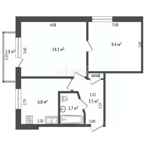 Общая площадь квартиры составляет 49,2 кв.м, из которых 27,2 кв.м жилая площадь и 7,3 кв.м - кухня.