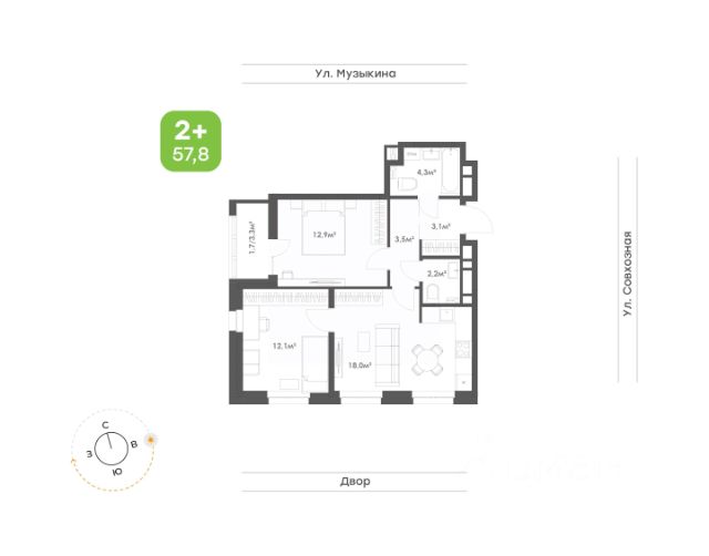 Двухкомнатная квартира евроформата • Две спальных комнаты правильной геометрической формы. В каждой комнате найдется зона для хранения; • Просторный холл 8,1 кв.м с нишей под шкаф-купе; • Два санузла; • Большая кухня-гостиная для общения и отдыха всей семьи, а с лоджии можно наблюдать закат.