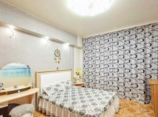 В квартире остаётся мебель: кухонный гарнитур, кондиционер, встроенный большой шкаф, шторы, люстры.