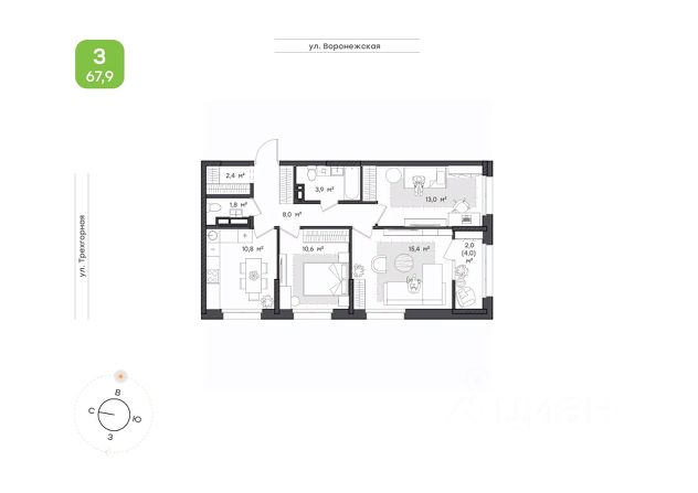 Семейная трехкомнатная квартира формата 3+ • Просторный холл 14,4 кв.м с нишей под шкаф-купе; • Три спальных комнаты правильной геометрической формы. В каждой комнате найдется зона для хранения; • В восточной спальне дополнительное окно, из которого будет видно рассвет; • Кухня-гостиная с выходом на лоджию; • Два совмещенных санузла.