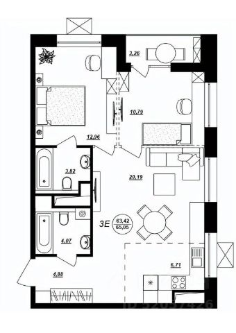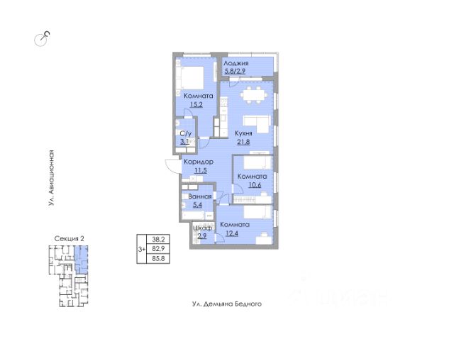 + индивидуальная планировка: общая площадь 106,3 кв.м. (без учета балконов), из них 2 раздельные комнаты 21,8+18 кв.м. и просторная кухня/гостиная 39,4 кв.м.;