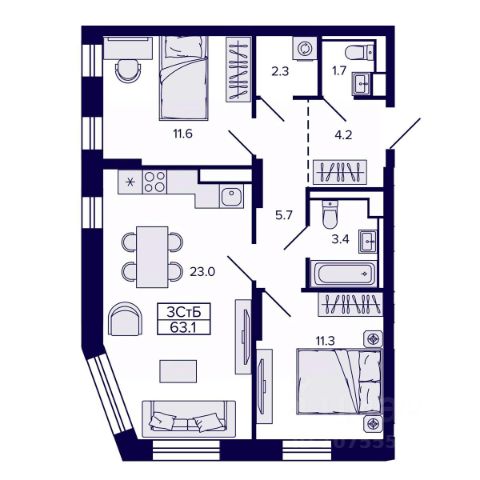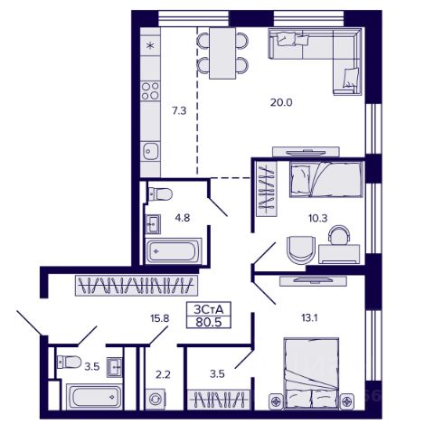 Квартира состоит из просторной кухни гостиной, две спальни, совмещенный санузел и просторная лоджия.