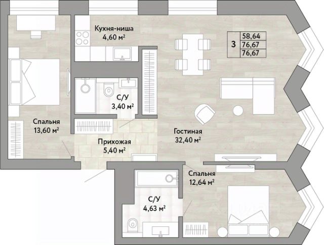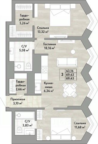 Просторная светлая 3-комнaтная кваpтира 67 м². Здесь 3 отдельные комнаты, кухня-гостиная для семейных посиделок, 2 комфортных санузла, гардеробная и балкон, который можно оборудовать как зону отдыха или кабинет.