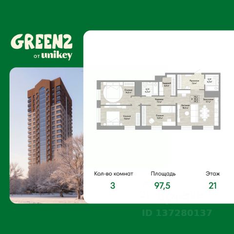 3-комн. квартира от застройщика в ЖК "Green 2" на 19 этаже. Квартира без отделки, новый собственник может сделать ремонт по индивидуальному дизайн-проекту. Общая площадь: 97.5 кв.м., жилая: 42.1 кв.м., площадь просторной кухни-столовой: 26 кв.м. Квартира угловая, очень светлая, естественная вентиляция при открытии окон. В квартире два совмещенных санузла. Высота потолков 2.7 м.