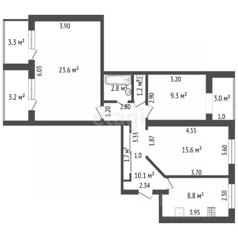 На общей площади 69 м2 расположены 2 изолированные спальни (родительская и детская), разделенные просторным 12-метровым коридором и ванной комнатой и туалетом.