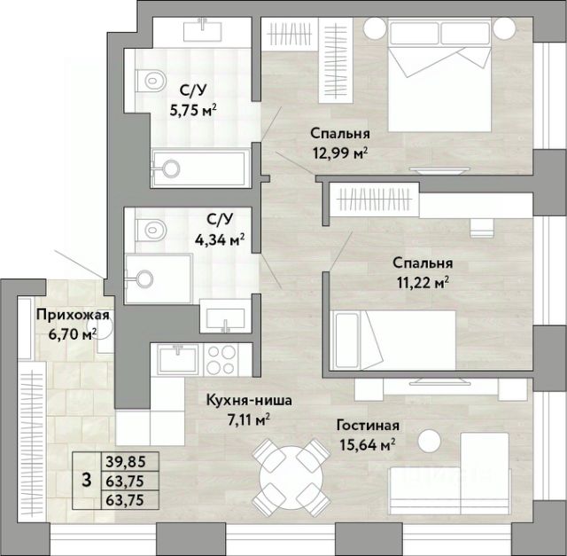 Продается четырехкомнатная квартира с европланировкой в ЖК "Сердце Бонивура" на 13 этаже. Квартира без отделки, полностью готова к чистовой отделке и дальнейшему ремонту. Общая площадь: 97.8 кв.м., жилая: 55.5 кв.м., общая площадь гостиной-столовой с кухонной зоной: 20.1 кв.м. Европланировка, кухня-гостиная - идеальный вариант для тех, кто любит часто принимать гостей. Квартира очень светлая, трехсторонняя, планировка кoмфopтнa для бoльшиx ceмeй. В квартире два совмещенных санузла. Высота потолков 2.85 м.