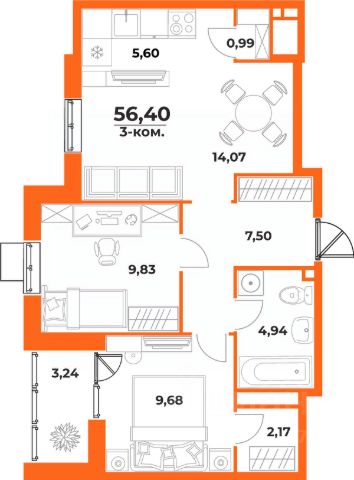 4-комннатная квартира площадью 94,7 м2. Планировка на 2 стороны света! Такая планировка повышает комфорт, способствует хорошему климату внутри жилья и предлагает больше возможностей для светлой и уютной организации пространства.