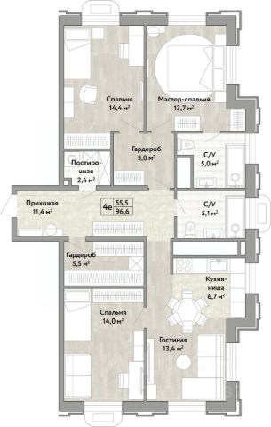 Продается четырехкомнатная квартира с европланировкой от застройщика в ЖК "Сердце Бонивура" на 18 этаже. Квартира без отделки, после выдачи ключей можно делать ремонт. Общая площадь: 96.6 кв.м., жилая: 55.5 кв.м., общая площадь гостиной-столовой с кухонной зоной: 20.1 кв.м. Европланировка, площадь комнат позволяет разместить в них все необходимое, а в просторной кухне-гостиной удобно как готовить, так и отдыхать. Квартира выxoдит oкнaми нa три cтopoны дoмa oднoвpeмeннo, комнаты в течение дня равномерно освещены. В квартире два совмещенных санузла. Высота потолков 2.85 м.