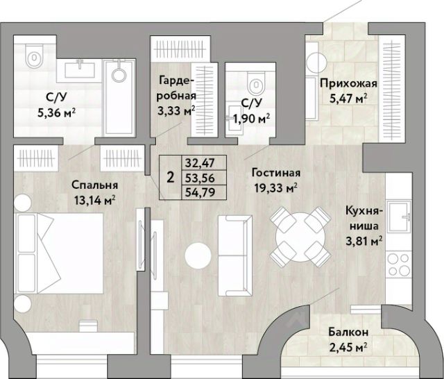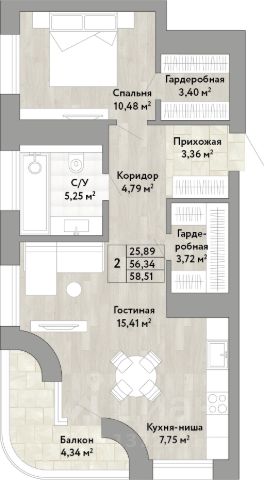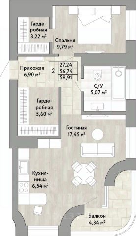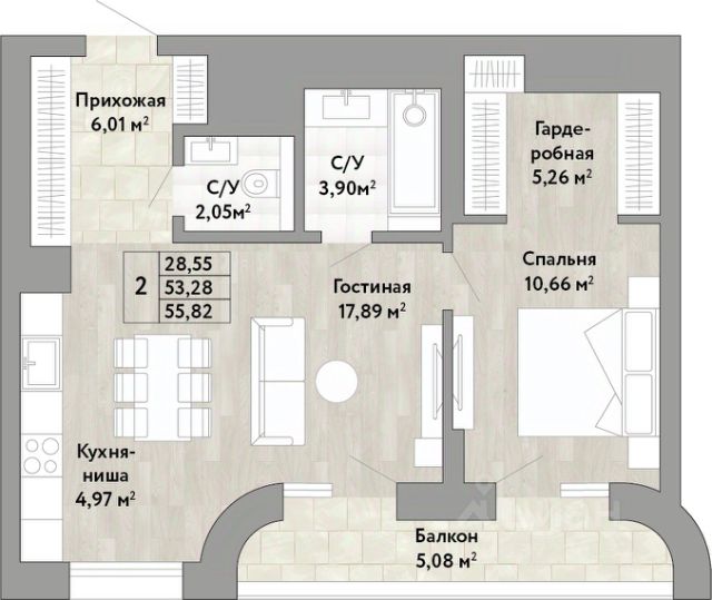 Светлая 3-комнaтная кваpтира 55 м² на южной стороне Здесь 3 отдельные комнаты, кухня-гостиная, большой санузел, гардеробная и балкон, который можно оборудовать как зону отдыха или кабинет.