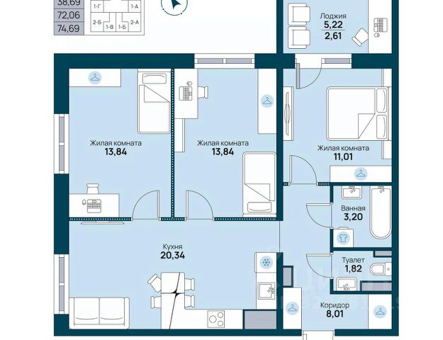 Двухкомнатная квартира для семьи с ребёнком; Эргономичная кухня вместит необходимую мебель и технику для реализации ваших кулинарных идей; Гардеробные ниши позволят не тратиться на шкафы и комоды и сохранить полезную площадь; Уютная лоджия станет отличным местом для релакса или хранения; Окна на 2 стороны света