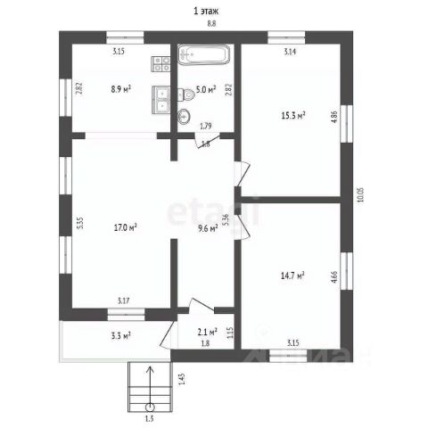 С лестницей на второй этаж, где находится мансардная, спальная комната.
