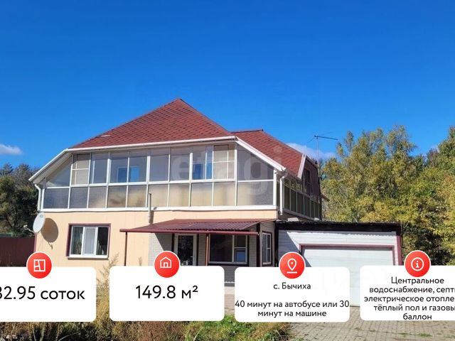 Продаём замечательный коттедж в заповедном и экологически чистом месте в селе Бычиха -всего в 20 километрах от города Хабаровска! Этот коттедж идеально подходит для тех, кто ценит комфорт и уют в сочетании с природой. Просторные комнаты, большие окна и качественные отделочные материалы создают атмосферу домашнего уюта, приглашая вас насладиться каждым моментом в новом доме. Для полноценной загородной жизни имеются баня и большой гараж. Коттедж двухэтажный, построен в 2017 году. Стены толстые, дом теплый и надежный. Межэтажное перекрытие - бетонные плиты, стены из газоблоков. Комбинированное отопление и система вентиляции обеспечивают оптимальный микроклимат в любое время года. На первом этаже в доме уложен теплый пол, на втором этаже радиаторы. Отопление электро-котлом в зимний месяц обходится до 10 000 рублей, что очень экономно! Вода централизованная, питьевая, чистая. Главной особенностью дома является его благоустроенность и просторность - 180 кв.м (в площадь дома не входят большой подвал и чердак). На первом этаже находятся кухня и гостиная, ванная комната с санузлом, гардеробная, галерея. На втором этаже две спальные комнаты, рабочий кабинет, вторая большая ванная комната и отдельный туалет. Из дома ведет выход в просторный теплый гараж, а через галерею можно попасть в свою уютную баню. Каждое помещение задумано с вниманием к комфорту жильцов. Коттедж полностью готов к проживанию. Участок вокруг коттеджа можно превратить в настоящее оазис. Здесь есть все условия для создания фруктового сада или огорода, где ваша семья сможет собирать урожай прямо с грядки. Зелёная территория позволит проводить время на свежем воздухе, организовывать пикники и наслаждаться приятными беседами с близкими в тени деревьев. Инфраструктура села также вас порадует: имеются школа, детский сад, амбулатория, аптека, почта, Сбербанк, магазины, парикмахерская и прочее. Близость к городу Хабаровску добавляет удобства, сохраняя уединение и спокойствие. Не упустите возможность стать владельцем этого замечательного коттеджа! Звоните, чтобы договориться о просмотре дом вашей мечты ждет вас!