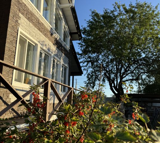 Сам дом свежей постройки из сип панелей (2018г), в 2024 году обшит фасадными панелями docke все со вкусом. На территории имеется строительный вагончик, который используется для хранения инструментов и техники, а также теплая будка для собаки. В 2025г двор был выложен плиткой.
