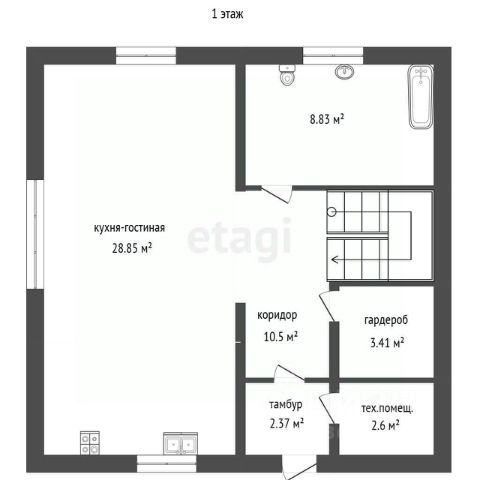 С лестницей на второй этаж, где находится мансардная, спальная комната.