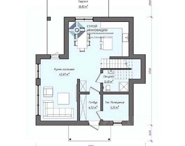 На первом этаже: прихожая, просторная кухня с обеденной зоной и гостиная. При строительстве использовались качественные современные материалы.
