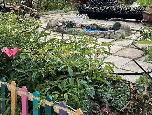 С двух сторон дома шланги, которые подключены к системе, для удобного полива. Земля плодородная, урожая много, начиная с зелени заканчивая ягодами.