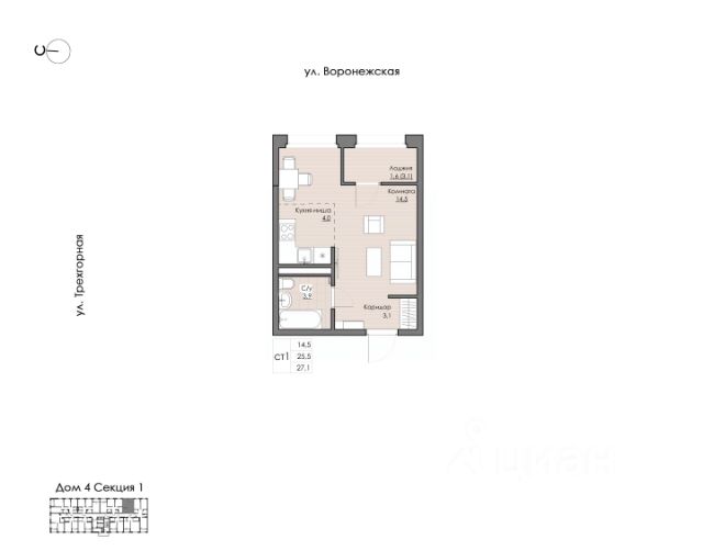 Компактная и функциональная студия для молодой семьи и людей, ценящих спокойную и уединённую жизнь. Кухня-ниша легко вместит всю необходимую технику для реализации ваших кулинарных фантазий. Гостиная позволит зонировать место для отдыха, учёбы и работы. Лоджия станет отличным местом для релакса.