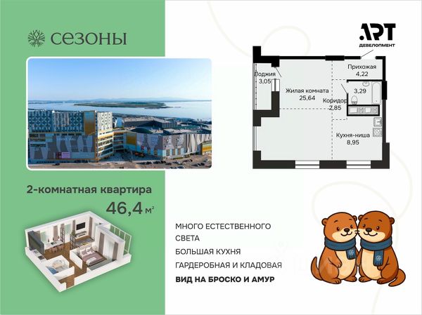 Осенние скидки! Выгода до 1,9 миллиона рублей. Квартира 43,4 кв.м свободной планировки с видами на город, Амур и Броско. - кладовая - большой санузел - панорамное остекление балкона - кухня-гостиная - вид на Амур ДВ ипотeка 2%, семейная ипотека 6%. Льготная ипотека без удорожания, трейд-ин Семейная комбо-ипотека до 15 млн 0% индивидуальное предложение от застройщика Отделка вайтбокс 13 000 руб за кв.м. - 3 минуты до центра на авто - 11 маршрутов общественного транспорта - 2 минуты пешком до Броско и аквапарка - 5 минут пешком до школы - 3 минуты пешком до детского сада - 30 шагов до паркинга в доме - 1 взгляд до вдохновляющих видов ЗАКРЫТАЯ ТЕРРИТОРИЯ Территория двора огорожена забором, и будет много камер. Доступ на территорию будет регулироваться воротами с индивидуальным доступом, отдельно будет настроен доступ в дом, паркинг, велосипедные и колясочные пространства. ИНТЕРЕСНЫЙ ДВОР, АТМОСФЕРНЫЕ ПРОСТРАНСТВА ДОМА Стильное пространство холла с высоким потолком, французскими окнами и качественной отделкой. По территории двора ограничен проезд, бОльшая часть парковок находится под землей. Предусмотрены также и гостевые парковки они расположены снаружи комплекса вдоль коммерческих помещений. Авторская детская площадка: длинная горка, тактильная дорожка, батуты, скалодром и канаты. Двор будет уникальным. Есть воркаут-зона для занятий спортом, и есть место где можно почитать книгу и тропа в травах, для создания которой растения с цветением по разным сезонам высадят согласно дендроплану. АРХИТЕКТУРА, ПЛАНИРОВКИ Комплекс состоит из трех зданий переменной этажности, второе и третье здание соединены двухэтажным стилобатом, в котором разместятся компании для ежедневного комфорта жителей дома: магазины, кофейня, салон красоты, детское обучение и досуг. Мы видим ценность в долговечных фасадных решениях, поэтому выбрали сочетание керамогранита и клинкерного кирпича. Предусмотрели ненавязчивую пластику фасада, архитектурную подсветку в специальных нишах. В первом доме заложены квартиры свободной планировки для воплощения вашего сценария жизни в диапазоне от 35,33 до 122,99 кв.м. ИЗ ТЕПЛОЙ КВАРТИРЫ В ТЕПЛЫЙ ПАРКИНГ В подземный паркинг спускаются все три быстрых лифта. Пробок не предвидится даже в час пик. КАЧЕСТВЕННОЕ ОКРУЖЕНИЕ От Сезонов до школы ноль перекрестков, рядом можно поесть разнообразно и вкусно, сводить ребенка в игровое пространство, купить продукты в минимаркете или в гипермаркете Броско. Кинотеатр через дорогу, новый корпус Броско Волна. У вас много возможностей. Все продажи ведутся через безопасные эскроу-счета.