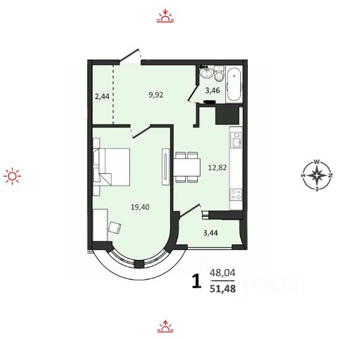 Квартира евроформата с продуманной планировкой • Холл 5,6 кв.м. с нишей, где можно организовать гардеробную или мягкую зону; • Функциональное деление самой большой комнаты с 2-мя окнами на кухню и гостиную; • Отдельная спальня с местом под хранение и выходом на лоджию; • Совмещенный санузел 3,9 кв.м; • Окна квартиры выходят во двор.