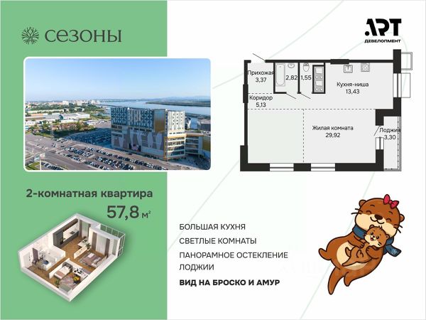 Осенние скидки! Выгода до 1,9 миллиона рублей. Стартовые цены - от 7,5 миллионов рублей. Квартира 58,62 м2 свободной планировки с видами на Амур и Броско. - светлые комнаты - панорамное остекление лоджии - большая кухня - вид на Броско и Амур ДВ ипотeка от 0,6%, семейная ипотека от 4,6%! Льготная ипотека без удорожания Семейная комбо-ипотека до 15 млн 0% индивидуальное предложение от застройщика, трейд-ин - 3 минуты до центра на авто - 11 маршрутов общественного транспорта - 2 минуты пешком до Броско - 5 минут пешком до школы - 3 минуты пешком до детского сада - 30 шагов до паркинга в доме - 1 взгляд до вдохновляющих видов ЗАКРЫТАЯ ТЕРРИТОРИЯ Территория двора огорожена забором, и будет много камер. Доступ на территорию будет регулироваться воротами с индивидуальным доступом, отдельно будет настроен доступ в дом, паркинг, велосипедные и колясочные пространства. ИНТЕРЕСНЫЙ ДВОР, АТМОСФЕРНЫЕ ПРОСТРАНСТВА ДОМА Стильное пространство холла с высоким потолком, французскими окнами и качественной отделкой. По территории двора ограничен проезд, бОльшая часть парковок находится под землей. Предусмотрены также и гостевые парковки они расположены снаружи комплекса вдоль коммерческих помещений. Авторская детская площадка: длинная горка, тактильная дорожка, батуты, скалодром и канаты. Двор будет уникальным. Есть воркаут-зона для занятий спортом, и есть место где можно почитать книгу и тропа в травах, для создания которой растения с цветением по разным сезонам высадят согласно дендроплану. АРХИТЕКТУРА, ПЛАНИРОВКИ Комплекс состоит из трех зданий переменной этажности, второе и третье здание соединены двухэтажным стилобатом, в котором разместятся компании для ежедневного комфорта жителей дома: магазины, кофейня, салон красоты, детское обучение и досуг. Мы видим ценность в долговечных фасадных решениях, поэтому выбрали сочетание керамогранита и клинкерного кирпича. Предусмотрели ненавязчивую пластику фасада, архитектурную подсветку в специальных нишах. ИЗ ТЕПЛОЙ КВАРТИРЫ В ТЕПЛЫЙ ПАРКИНГ В подземный паркинг спускаются все три быстрых лифта. Пробок не предвидится даже в час пик. КАЧЕСТВЕННОЕ ОКРУЖЕНИЕ От Сезонов до школы ноль перекрестков, рядом можно поесть разнообразно и вкусно, сводить ребенка в игровое пространство, купить продукты в минимаркете или в гипермаркете Броско. Кинотеатр через дорогу, новый корпус Броско Волна. У вас много возможностей. Все продажи ведутся через безопасные эскроу-счета.