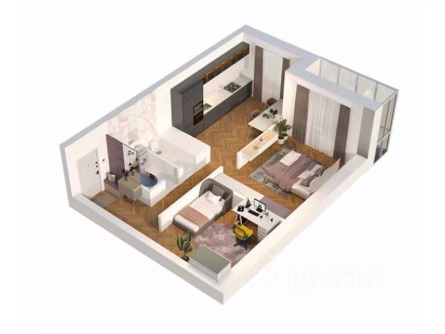 Двухкомнатная квартира для семьи с ребёнком; Эргономичная кухня вместит необходимую мебель и технику для реализации ваших кулинарных идей; Гардеробные ниши позволят не тратиться на шкафы и комоды и сохранить полезную площадь; Уютная лоджия станет отличным местом для релакса или хранения; Окна на 2 стороны света